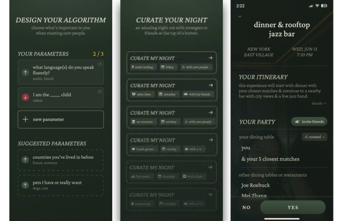 اپلیکیشن 222 یک پلتفرم رویدادهای اجتماعی فقط iOS است که با جفت کردن گروهی از غریبهها بر اساس نتایج آزمون شخصیتشان، ملاقاتهای حضوری را تسهیل میکند. این اپلیکیشن دعوتنامههایی برای رویدادهای اجتماعی عمومی نزدیک، مانند بارهای شراب و کلوبهای کمدی ارسال میکند. سپس یک فرآیند بررسی وجود دارد و شرکتکنندگان منتخب در روز رویداد مطلع میشوند. یک امتیاز مثبت برای کسانی که اضطراب اجتماعی دارند: شما مجاز هستید یک نفر همراه بیاورید.
