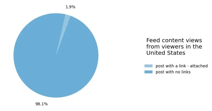 متا در گزارش شفافیت خود برای سهماهه سوم اعلام کرد که بیش از ۹۸ درصد بازدیدها در فید در ایالات متحده از پستهایی است که هیچ لینکی ندارند. مشخص نیست که آیا این سیگنال شرکت را به آزمایش محدودیت اشتراکگذاری لینک سوق داده است یا خیر. این شرکت گفت که بیشتر ۱.۹ درصد بازدید از پستهای دارای لینک از صفحهای بوده که دنبال میکردند. پستهای لینکشده که توسط دوستان و گروهها به اشتراک گذاشته شده بودند، حداقل بودند.