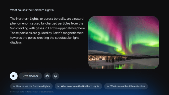 در CES، گوگل نشان داد که این چگونه کار میکند. هنگامی که کاربران سوالی درباره چیزی که میخواهند یاد بگیرند میپرسند، صفحه نمایش تلویزیون میتواند به صورت عمیق به موضوع بپردازد. یک نمای کلی تعاملی با روایت، مفاهیم را ساده میکند و کاربران میتوانند سوالات بعدی را برای یادگیری بیشتر بپرسند.