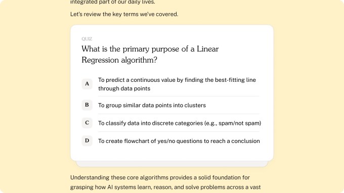 این پلتفرم، که رسماً در سپتامبر راهاندازی شد، به کاربران امکان میدهد یک هدف یادگیری را تعریف کرده و از هوش مصنوعی برای ایجاد یک دوره آموزشی برای خود استفاده کنند.