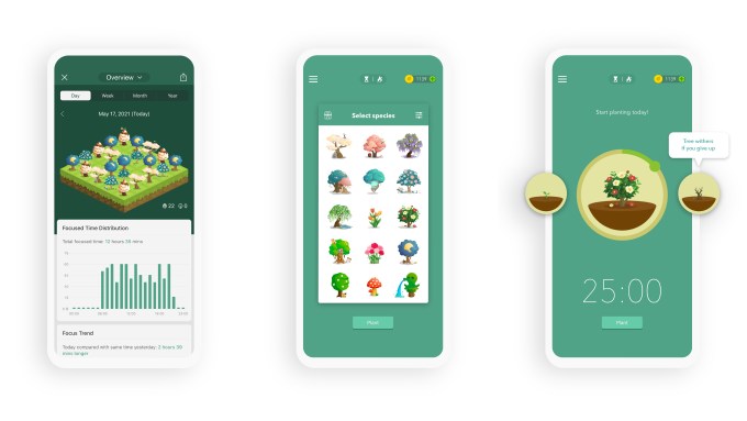 Forest بهرهوری را با حمایت از تلاشهای زیستمحیطی واقعی، بازیسازی میکند. هنگامی که نیاز به تمرکز دارید، اپلیکیشن را باز کرده و یک درخت مجازی میکارید. درخت با تمرکز شما رشد میکند تا زمانی که تایمر تمام شود. اگر زودتر از اپلیکیشن خارج شوید، درخت پژمرده شده و میمیرد.