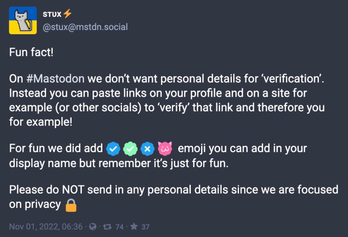 برخی سرورها با ایده تأیید هویت به روشی غیررسمی سرگرم شدهاند. به عنوان مثال، سرور mstdn.social به شما امکان میدهد تیکهای آبی و سفید و سایر ایموجیها را به نام نمایشی خود اضافه کنید، اگر مایل باشید، که باعث میشود تأیید شده به نظر برسید، حتی اگر اینها هیچ معنایی نداشته باشند. (تقریباً مانند سیستم تأیید هویت جدید توییتر! اما رایگان!)